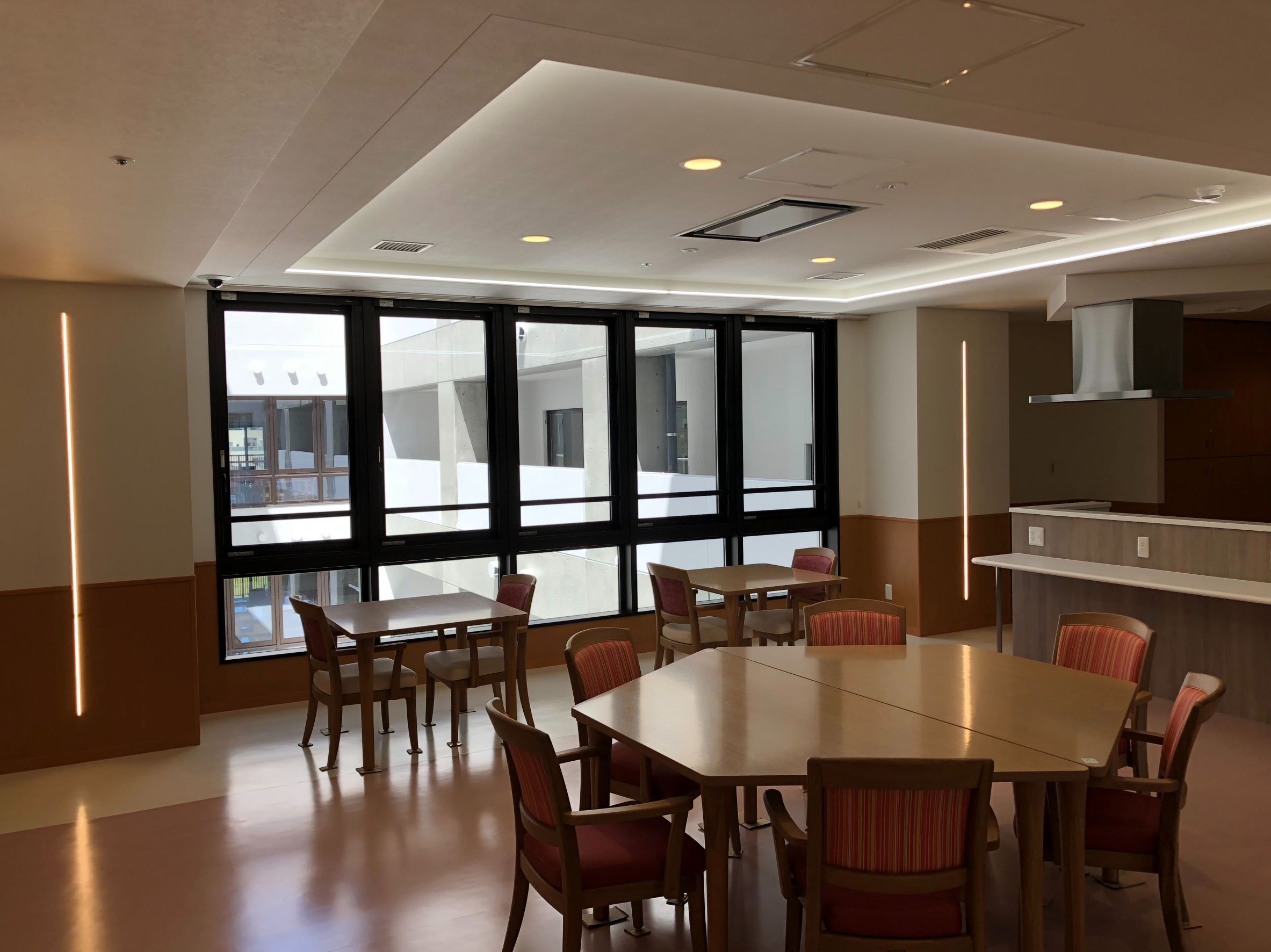 HOME | WORKS10 WORKS一覧に戻る 建物外観 仙台市茂庭 介護老人保健施設・介護付有料老人ホーム竣工:2018年6月建設場所:宮城県仙台市構造規模:RC造 地上5階 延べ面積 8,660㎡設備概要:地中熱ヒートポンプ 一部床輻射冷暖房 ZEB Ready受注先:(株)武田菱設計 共同生活室